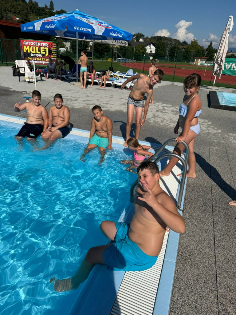 Sončno in toplo vreme je bilo kot naročeno za izvedbo našega prvega športnega dne. V petek, 5. 9. 2025 smo obiskali bazen v Šentjurju in preverili naše plavalne veščine. Dan smo izkoristili za čofotanje, plavanje, spuste po toboganu in skoke v vodo.