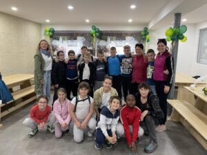 Že kar zjutraj smo imeli malo telovadbe, saj smo se sprehodili proti kmetiji, ki je nedaleč stran od železniške postaje v Šempetru. Od daleč smo zagledali napis KMETIJA FLIS, ki nam je pogrel srca, saj njihove izdelke že poznamo iz šole, kjer si želodčke razvajamo z njihovim mlekom, kefirjem in sadnimi jogurti. Sprejela nas je prijazna ga. Darija, ki nam je razkazala njihovo kmetijo. Ogledali smo si hlev, v katerem skrbijo za 180 glav živine. Razkazala nam je kmetijsko mehanizacijo, pokazala tudi teličke, goveda pasme Black Angus, njihovo ‘porodnišnico’ in ločevanje teličkov po starosti na ‘vrtec’, ‘osnovno šolo’, ‘srednjo šolo’ in ‘fakulteto’. Ogledali smo si tudi molzni stroj, ki na kmetiji Flis obratuje 24 ur na dan. Pogovarjali smo se o vzorcih na živalih, skrbjo za toliko živali, hranjenje krav, proces molžnje, proces pridelave mlečnih izdelkov in še kaj.