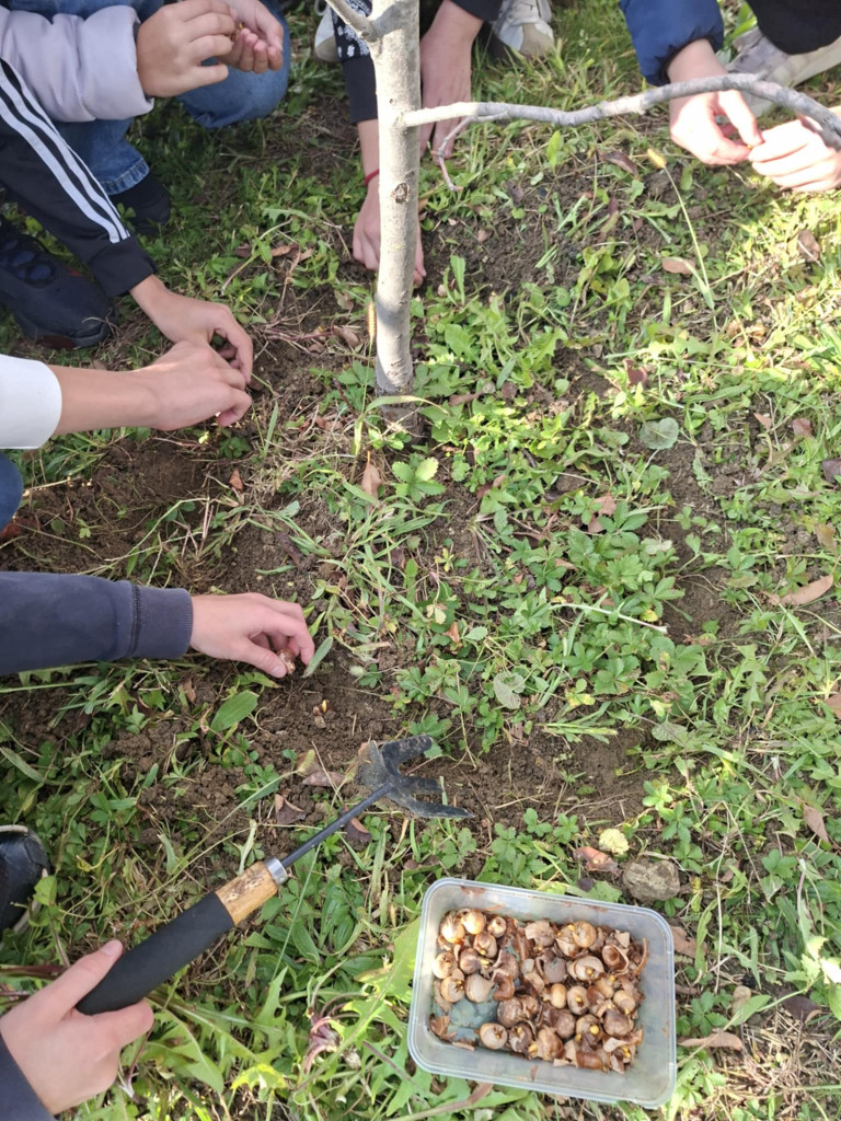 Skupaj z učenci izbirnega predmeta organizmi v naravi in umetnem okolju ter učiteljico Barbaro Oprešnik, smo v petek posadili čebulice rumenega krokusa.